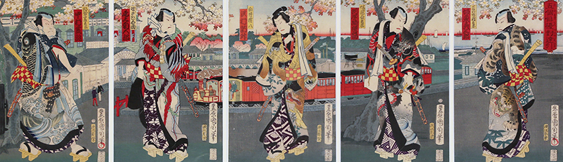 Cinco actores de teatro Kabuki y una locomotora de vapor (1871).