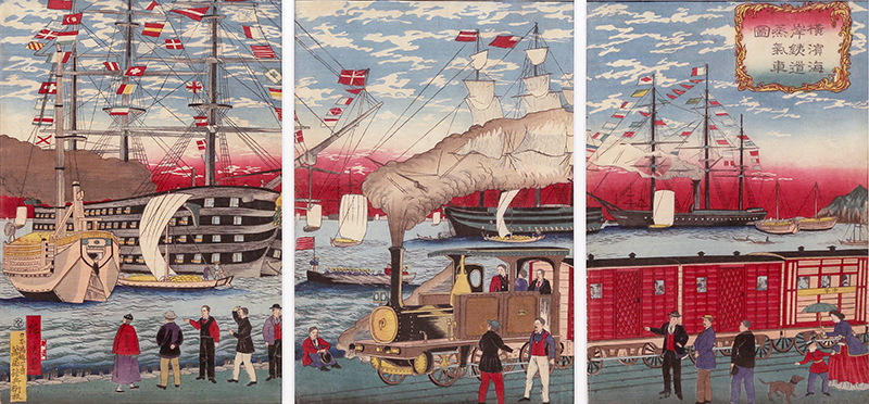 Artistas como Hiroshige III, Chikuyō, Ikkei, Kasamatsu, Kokunimasa, Kunichika, Kuniteru II, Kunisana II, Kunitoshi, Kyochika, Shigekiyo, Yoshitora o Yoshitoshi actuaron como cronistas visuales de una sociedad en cambio, incorporando la locomotora de vapor al imaginario del «mundo flotante». En sus composiciones, el tren atraviesa paisajes tradicionales, cruza puentes y convive con templos, campos y figuras cotidianas, donde no faltan los típicos jinrikisha (rickshaws), integrándose con naturalidad en escenas de delicada belleza.